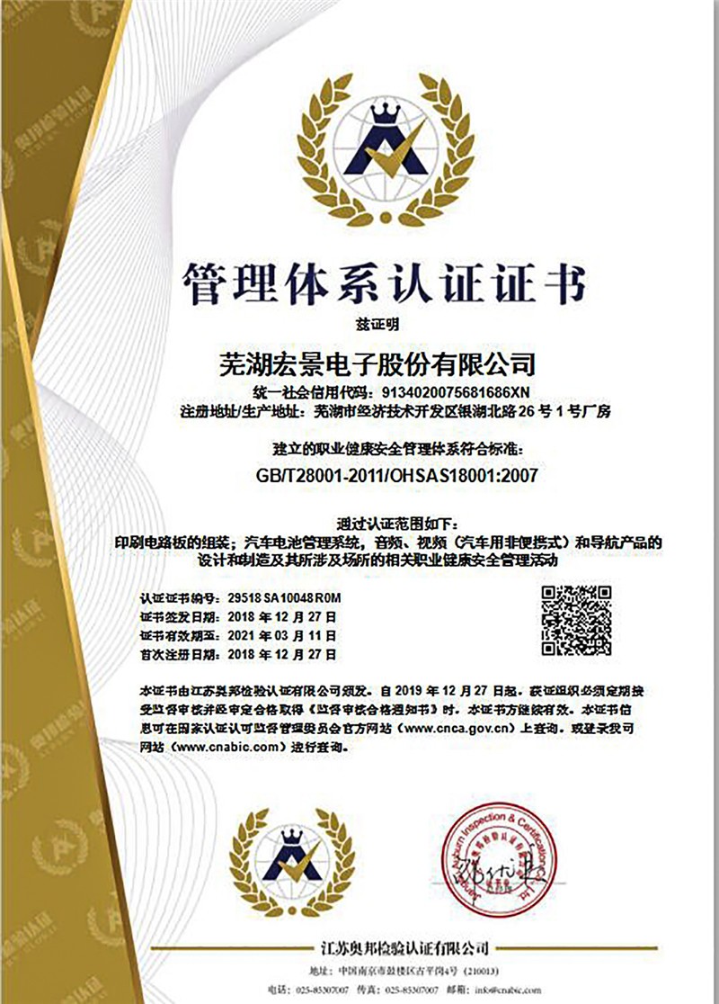 宏景电子是一家致力于汽车电子产品研发、制造和服务于一体的国家级高新技术企业、省级智能工厂、绿色工厂、省重点电子信息企业、工信部两化融合贯标企业、省抗疫产品保障企业。
